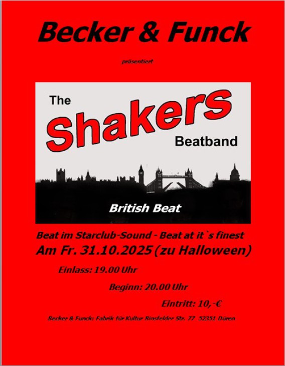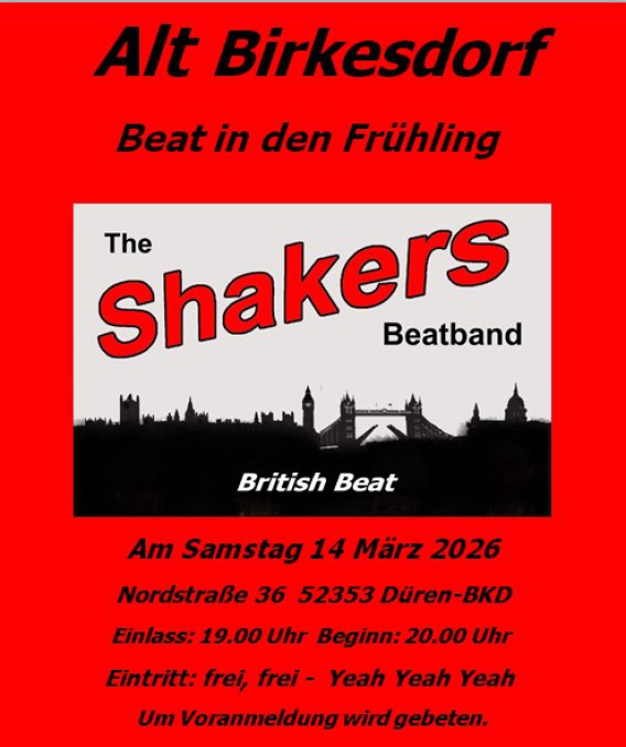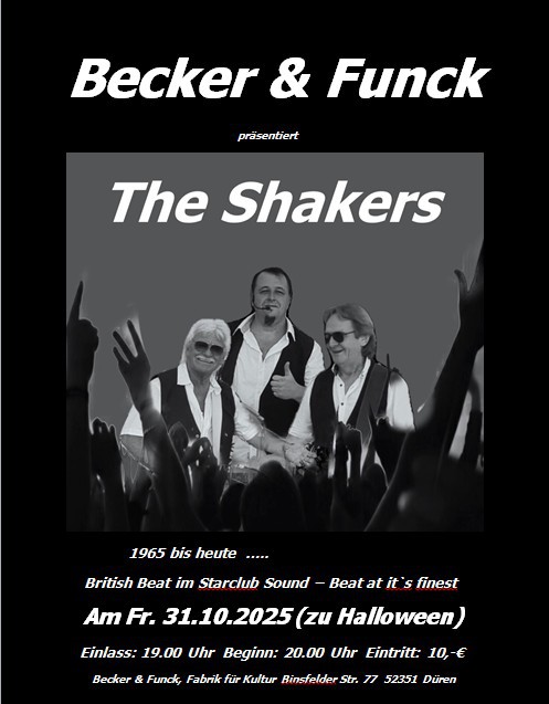 The Shakers - Beatband/ Beatmusik der 60er Jahre. Wir spielen für Sie in Düren, Eschweiler, Jülich, Aachen, Heinsberg, Alsdorf, Übach-Palenberg, Mönchengladbach, Neuss, Grevenbroich, Köln, Bonn, Düsseldorf, Euskirchen, Osnabrück, Bergisch Gladbach, Münster, Oldenburg, Wiesbaden, Leverkusen, Erftstadt, Koblenz, Bergheim, Stolberg, Bitburg, Siegburg, Bad Neuenahr, Solingen, Frechen, Krefeld, Dortmund, Wesel, Wuppertal, Nettetal, Brüggen, Moers, Duisburg, Essen, Gelsenkirchen, Iserlohn, Oberhausen, Frankfurt, Minden, Hannover, Bielefeld, Gütersloh, Trier und darüber hinaus.
